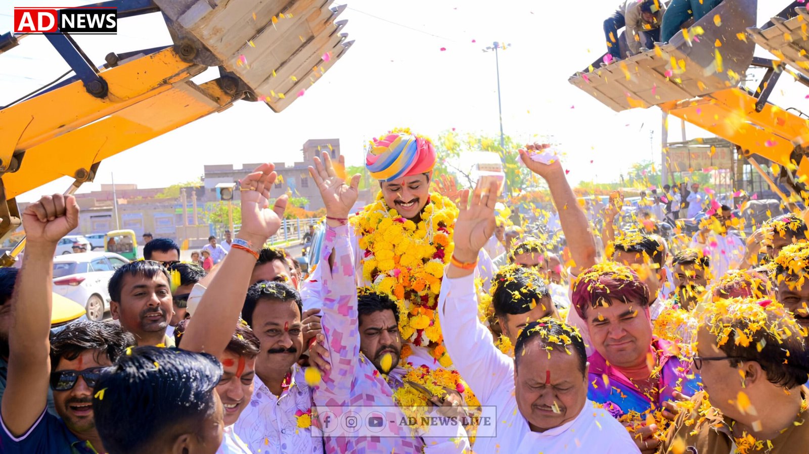 जसोल फांटा पर जेसीबी के माध्यम से पुष्प वर्षा कर अभिनंदन किया गया तथा भाजपा कार्यकर्ताओं ने मालाएं पहनाकर और गुलाल लगाकर स्वागत-सम्मान किया।
